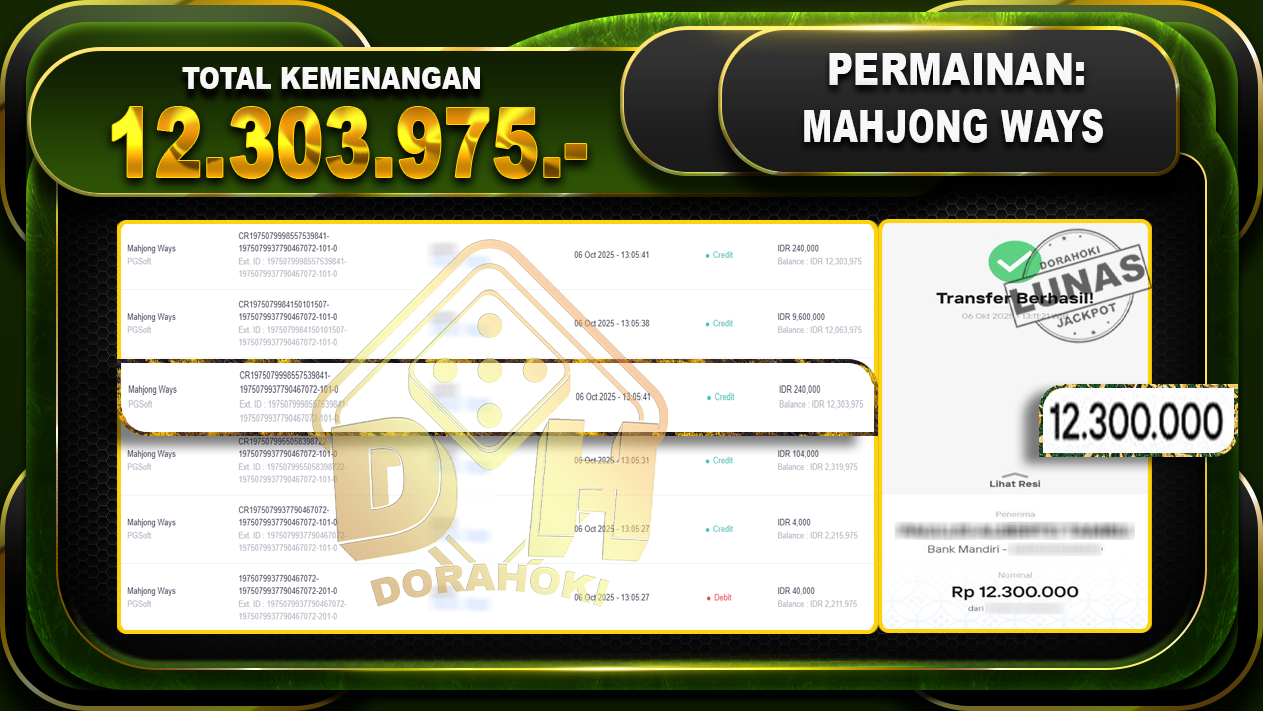 Bukti JP Mahjong Ways – ucapkan selamat kepada user id pauxxx atas kemenangan di Mahjong Ways dengan total kemenangan Rp.12.303.975,- Yang pasti nya langsung LUNAS sesuai bukti ya bosku. Dorahoki nih bosku berapapun akan tetap kami bayar lunas ya bosku