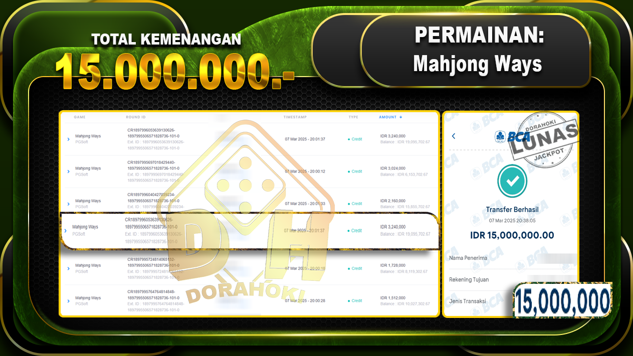 Bukti JP MAHJONG WAYS – ucapkan selamat kepada user id Abaxxx atas kemenangan di MAHJONG WAYS dengan total kemenangan Rp.15.000.000,- . Yang pasti nya langsung LUNAS sesuai bukti ya bosku. Dorahoki nih bosku berapapun akan tetap kami bayar lunas ya bosku.