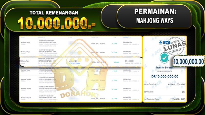 Bukti JP Mahjong Ways – ucapkan selamat kepada user id Praxxx atas kemenangan di Mahjong Ways dengan total kemenangan Rp.10.000.000,- Yang pasti nya langsung LUNAS sesuai bukti ya bosku. Dorahoki nih bosku berapapun akan tetap kami bayar lunas ya bosku