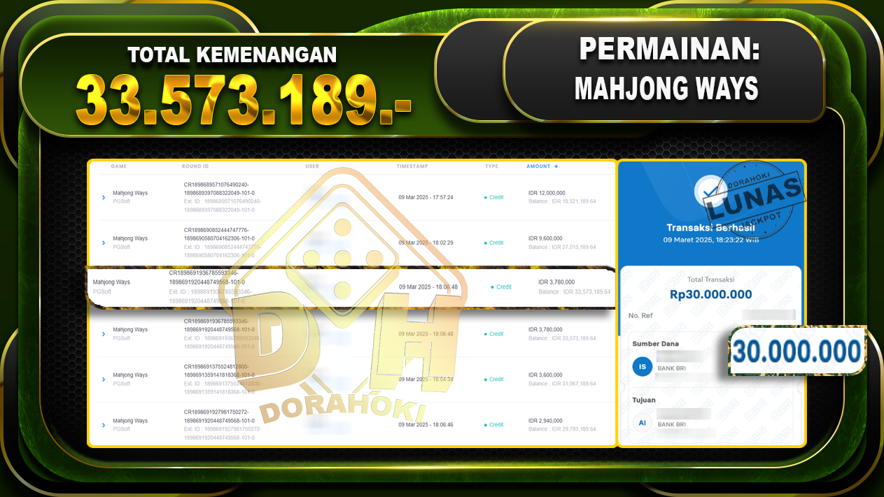 Bukti JP MAHJONG WAYS – ucapkan selamat kepada user id 8edxxx atas kemenangan di MAHJONG WAYS dengan total kemenangan Rp.33.573.189,- . Yang pasti nya langsung LUNAS sesuai bukti ya bosku. Dorahoki nih bosku berapapun akan tetap kami bayar lunas ya bosku.
