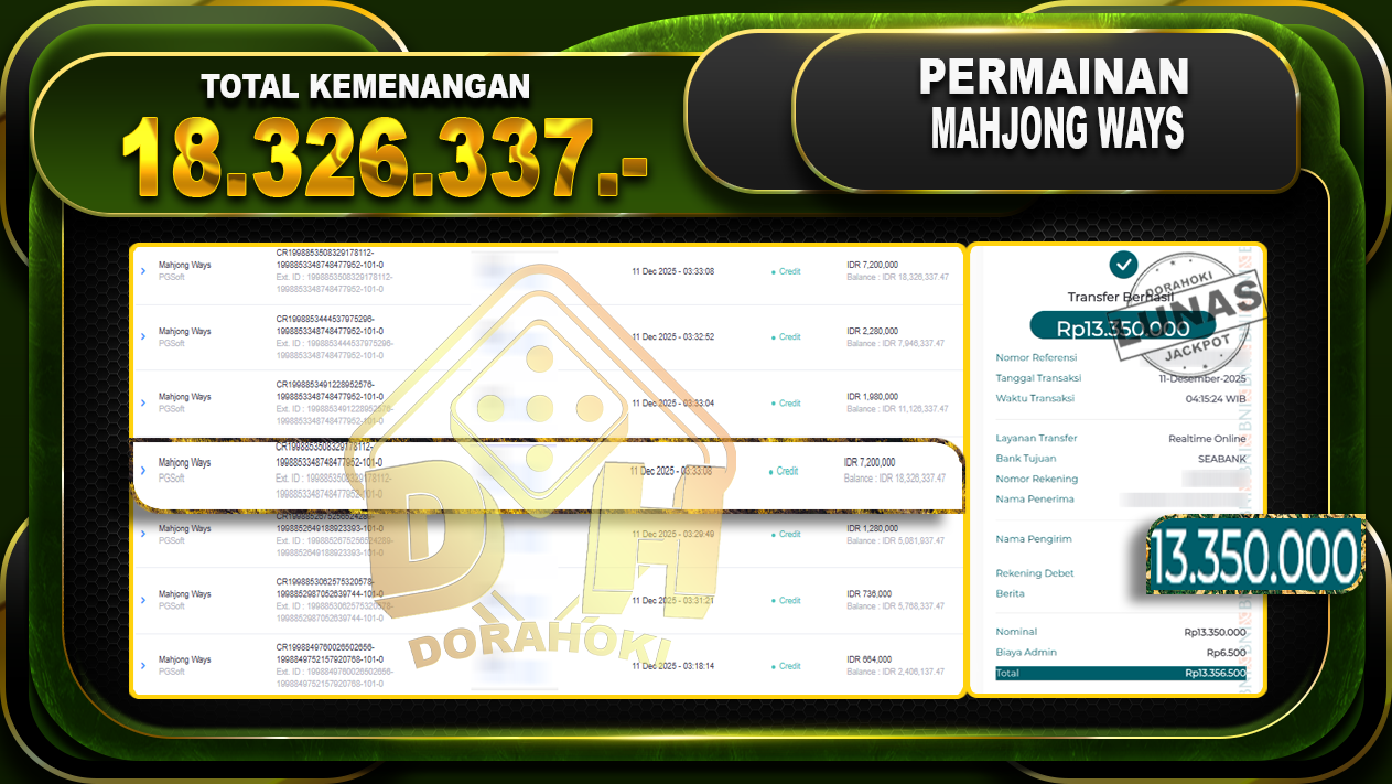 Bukti JP Mahjong Ways – ucapkan selamat kepada user id ontxxx atas kemenangan di Mahjong Ways dengan total kemenangan Rp.18.326.337,- Yang pasti nya langsung LUNAS sesuai bukti ya bosku. Dorahoki nih bosku berapapun akan tetap kami bayar lunas ya bosku