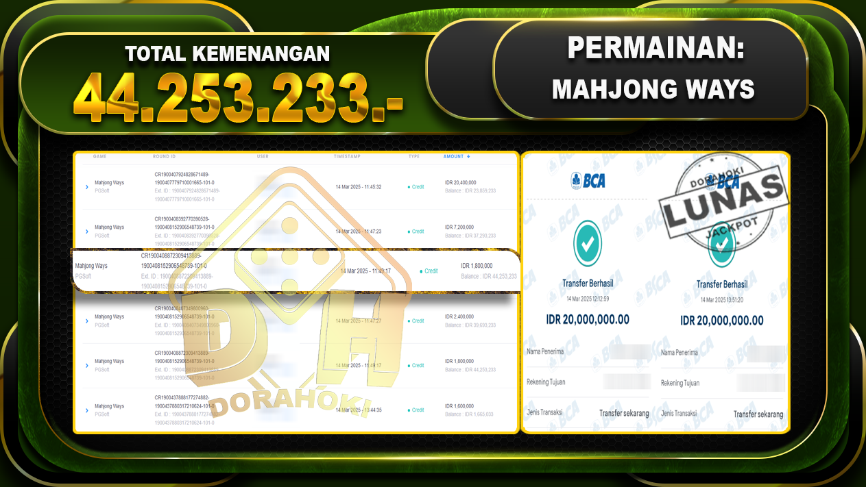 Bukti JP MAHJONG WAYS – ucapkan selamat kepada user id Ekoxxx atas kemenangan di MAHJONG WAYS dengan total kemenangan Rp.44.253.233,- . Yang pasti nya langsung LUNAS sesuai bukti ya bosku. Dorahoki nih bosku berapapun akan tetap kami bayar lunas ya bosku.