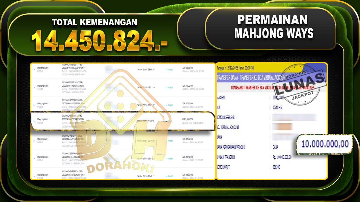 Bukti JP Mahjong Ways – ucapkan selamat kepada user id sigxxxxx atas kemenangan di Mahjong Ways dengan total kemenangan Rp.14.450.824,- Yang pasti nya langsung LUNAS sesuai bukti ya bosku. Dorahoki nih bosku berapapun akan tetap kami bayar lunas ya bosku