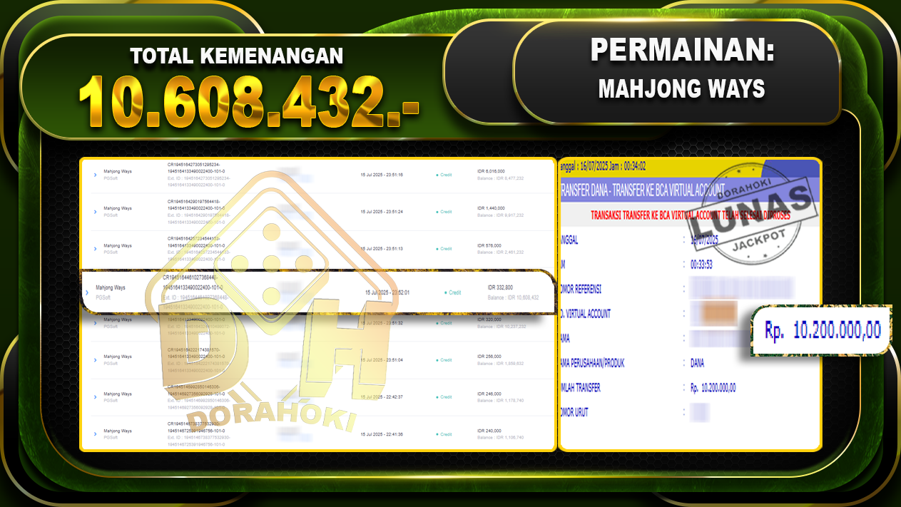 Bukti JP MAHJONG WAYS – ucapkan selamat kepada user id KOMxxx atas kemenangan di MAHJONG WAYS dengan total kemenangan Rp.10.608.432- . Yang pasti nya langsung LUNAS sesuai bukti ya bosku. Dorahoki nih bosku berapapun akan tetap kami bayar lunas ya bosku.