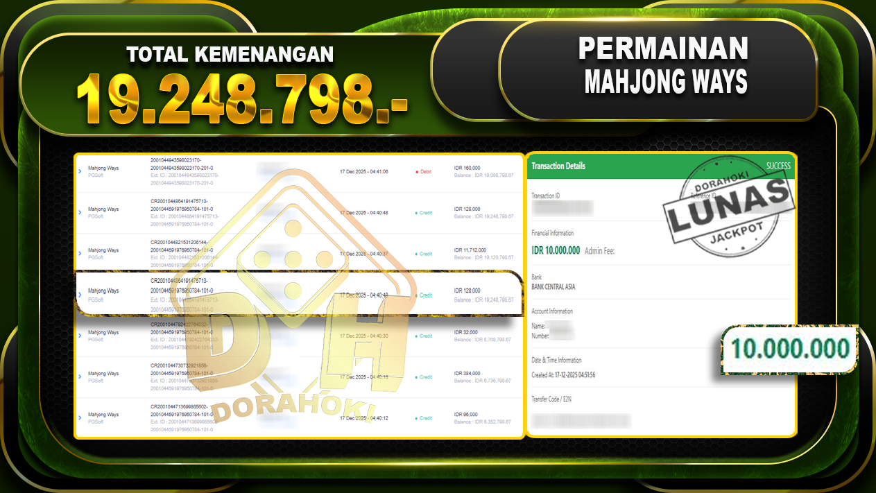 Bukti JP Mahjong Ways – ucapkan selamat kepada user id abaxxxxx atas kemenangan di Mahjong Ways dengan total kemenangan Rp.19.248.798,- Yang pasti nya langsung LUNAS sesuai bukti ya bosku. Dorahoki nih bosku berapapun akan tetap kami bayar lunas ya bosku