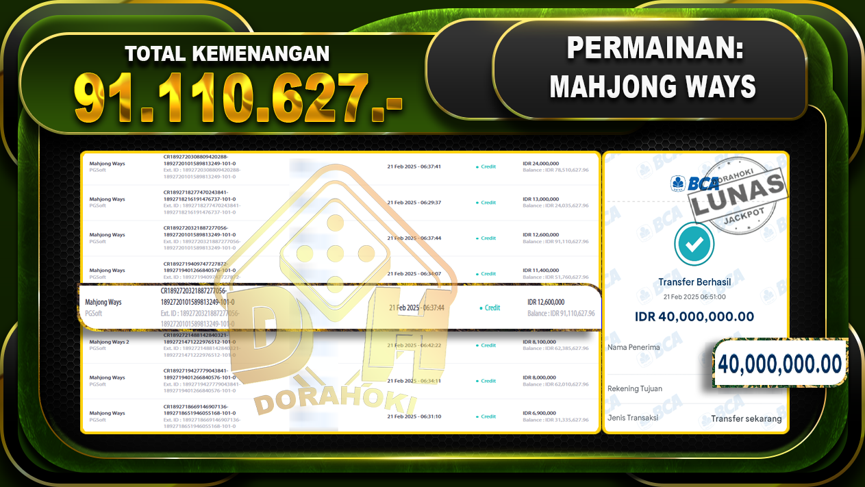Bukti JP MAHJONG WAYS – ucapkan selamat kepada user id Bbyxxx atas kemenangan di MAHJONG WAYS dengan total kemenangan Rp.91.110.627,- . Yang pasti nya langsung LUNAS sesuai bukti ya bosku. Dorahoki nih bosku berapapun akan tetap kami bayar lunas ya bosku.
