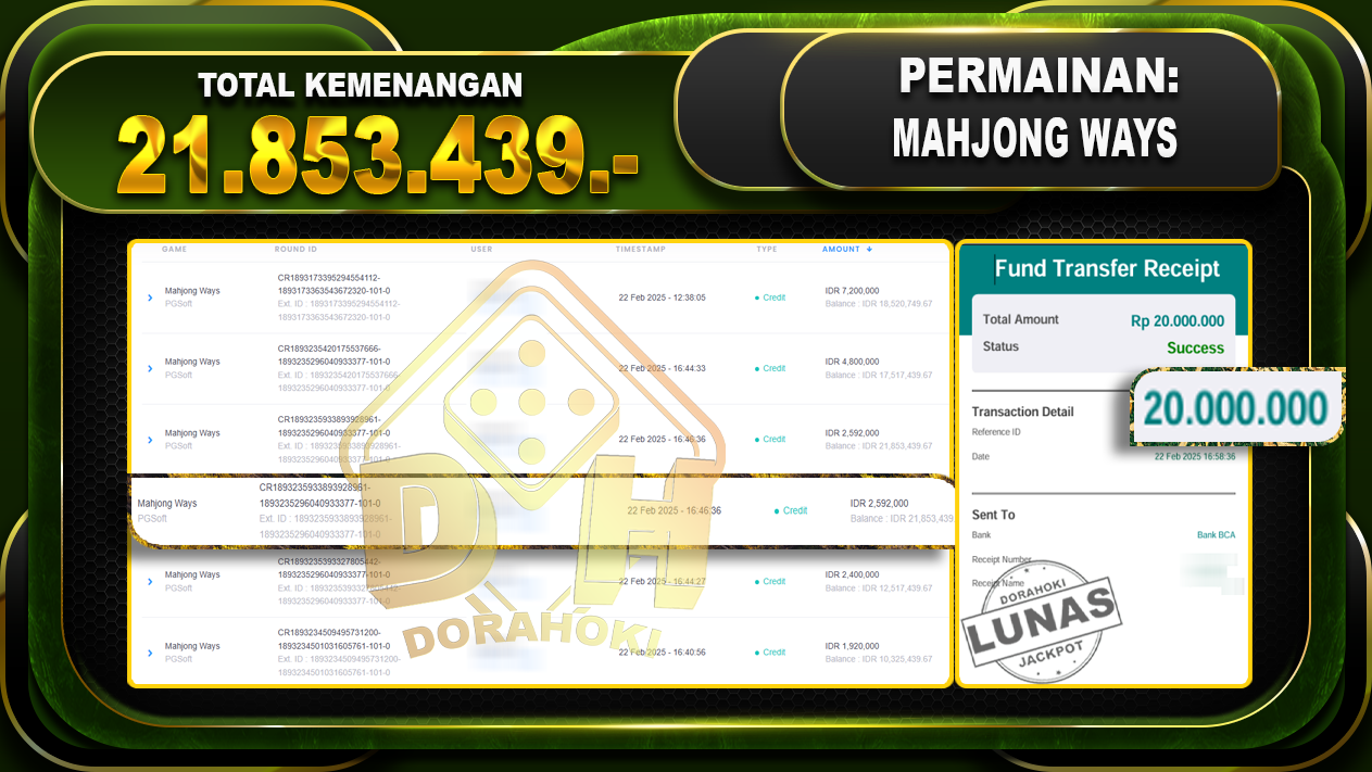 Bukti JP MAHJONG WAYS – ucapkan selamat kepada user id abayxxx atas kemenangan di MAHJONG WAYS dengan total kemenangan Rp.21.853.439,- . Yang pasti nya langsung LUNAS sesuai bukti ya bosku. Dorahoki nih bosku berapapun akan tetap kami bayar lunas ya bosku.