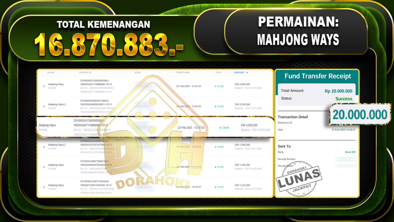 Bukti JP MAHJONG WAYS – ucapkan selamat kepada user id niaramaxxx atas kemenangan di MAHJONG WAYS dengan total kemenangan Rp.16.870.883,- . Yang pasti nya langsung LUNAS sesuai bukti ya bosku. Dorahoki nih bosku berapapun akan tetap kami bayar lunas ya bosku.