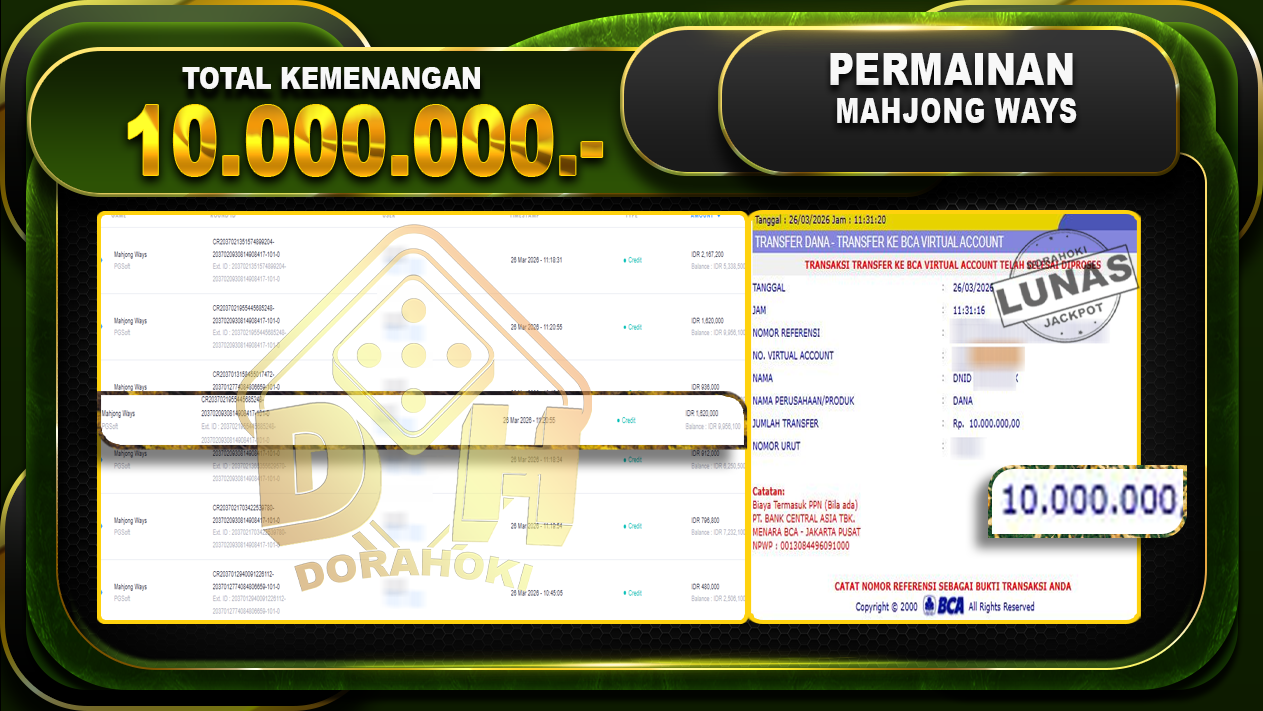 Bukti JP Mahjong Ways – Selamat Kepada User id Henxxx atas kemenangan Mahjong Ways Dengan Nominal Sebesar Rp 10.000.000,- . Yang pasti nya langsung LUNAS Sesuai Bukti.