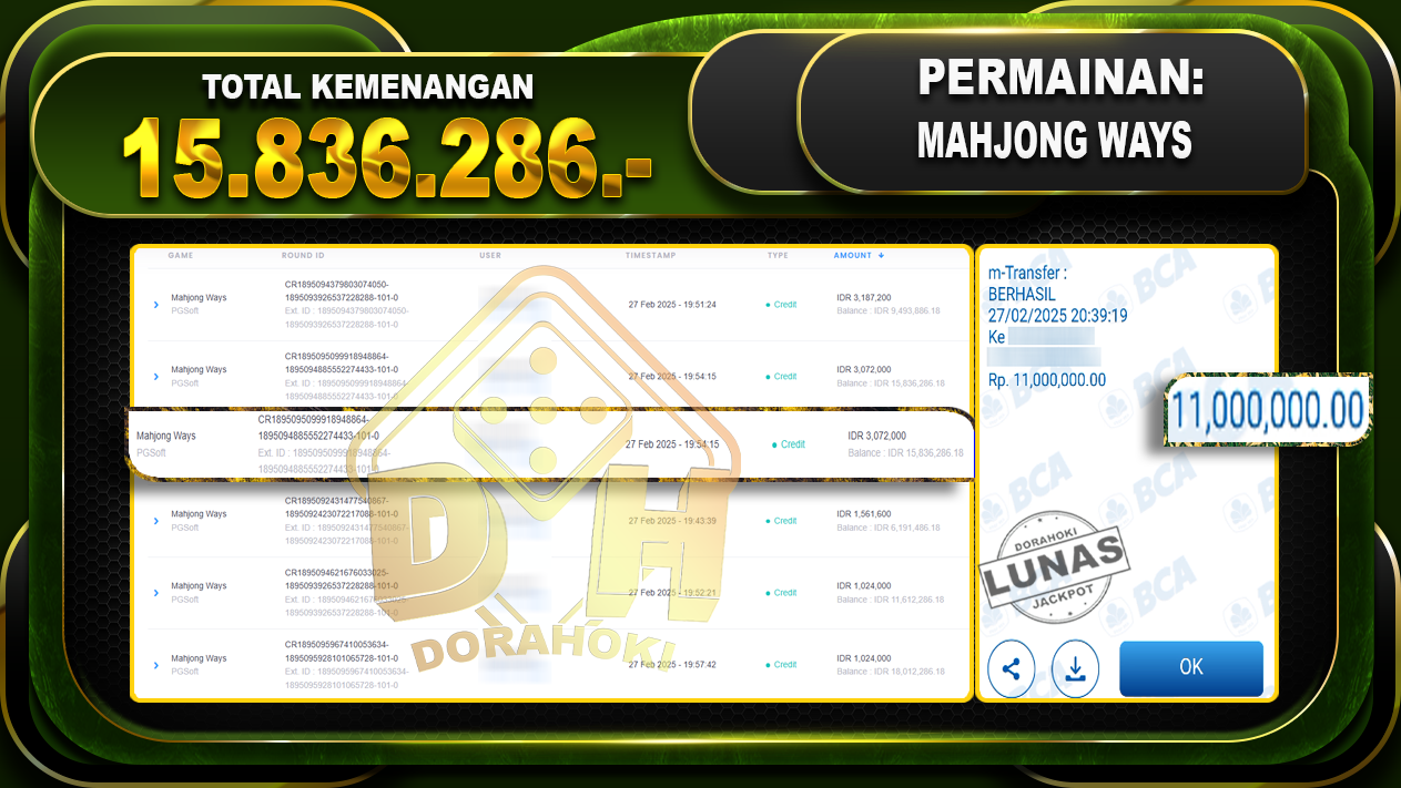 Bukti JP MAHJONG WAYS – ucapkan selamat kepada user id Bocxxx atas kemenangan di MAHJONG WAYS dengan total kemenangan Rp.15.836.286,- . Yang pasti nya langsung LUNAS sesuai bukti ya bosku. Dorahoki nih bosku berapapun akan tetap kami bayar lunas ya bosku.