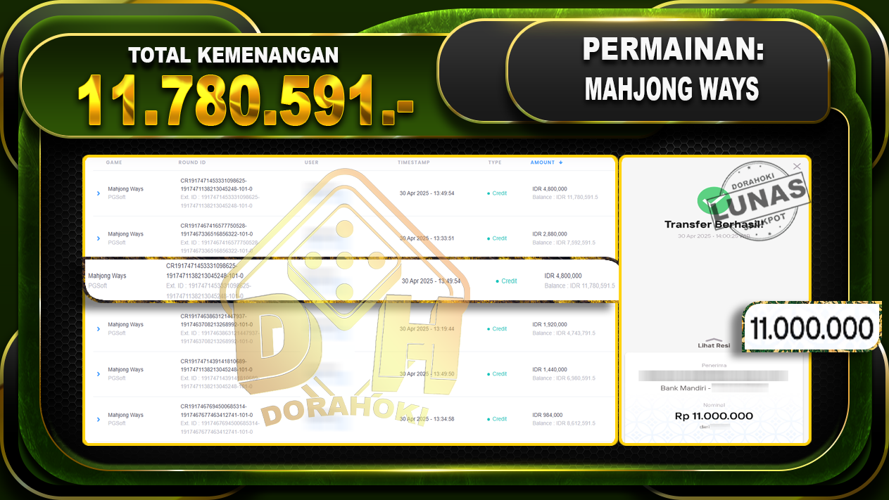 Bukti JP MAHJONG WAYS – ucapkan selamat kepada user id Bagxxx atas kemenangan di MAHJONG WAYS dengan total kemenangan Rp.11.780.591,- . Yang pasti nya langsung LUNAS sesuai bukti ya bosku. Dorahoki nih bosku berapapun akan tetap kami bayar lunas ya bosku.