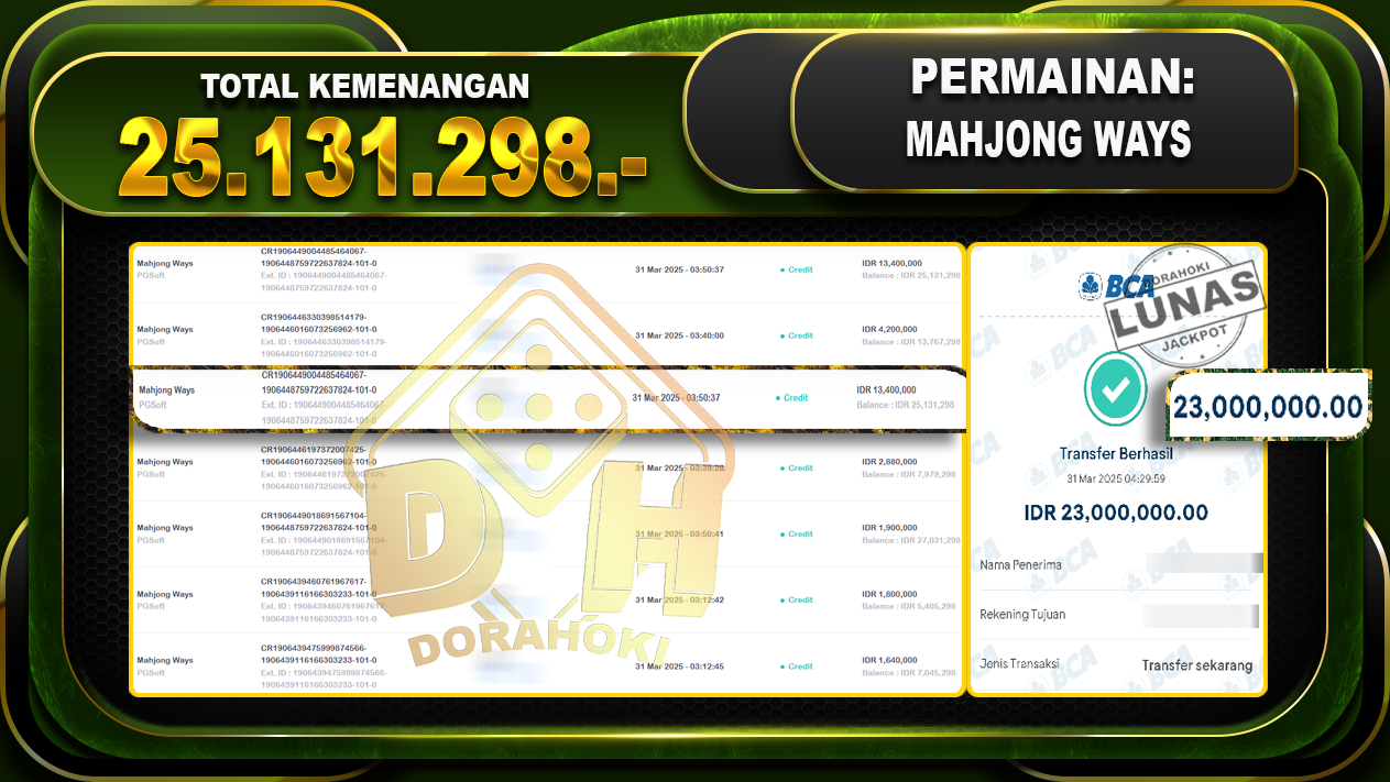 Bukti JP MAHJONG WAYS – ucapkan selamat kepada user id Arixxx atas kemenangan di MAHJONG WAYS dengan total kemenangan Rp.25.131.298,- . Yang pasti nya langsung LUNAS sesuai bukti ya bosku. Dorahoki nih bosku berapapun akan tetap kami bayar lunas ya bosku.