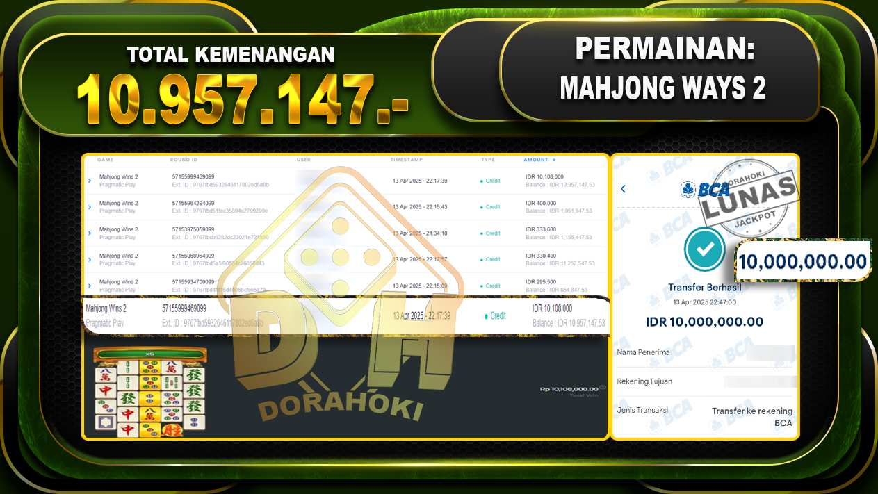 Bukti JP MAHJONG WINS 2 – ucapkan selamat kepada user id Syexxx atas kemenangan di MAHJONG WINS 2 dengan total kemenangan Rp.10.957.147,- . Yang pasti nya langsung LUNAS sesuai bukti ya bosku. Dorahoki nih bosku berapapun akan tetap kami bayar lunas ya bosku.