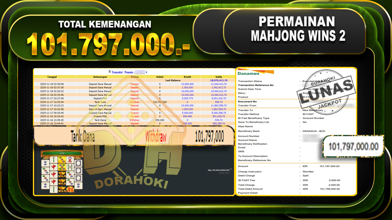 Bukti JP Mahjong Wins 2 – ucapkan selamat kepada user id jayxxxxx atas kemenangan di Mahjong Wins 2 dengan total kemenangan Rp.101.797.000,- Yang pasti nya langsung LUNAS sesuai bukti ya bosku. Dorahoki nih bosku berapapun akan tetap kami bayar lunas ya bosku.