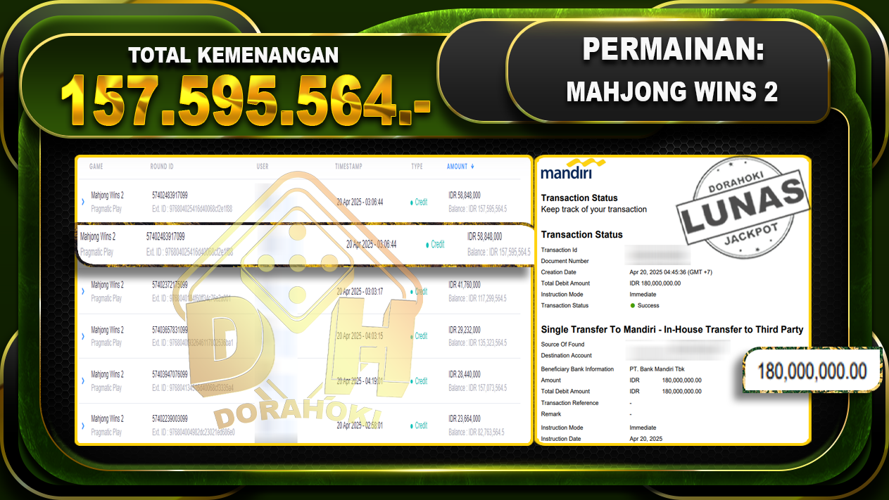 Bukti JP MAHJONG WINS 2 – ucapkan selamat kepada user id Dogxxx atas kemenangan di MAHJONG WINS 2 dengan total kemenangan Rp.157.595.564 .,- . Yang pasti nya langsung LUNAS sesuai bukti ya bosku. Dorahoki nih bosku berapapun akan tetap kami bayar lunas ya bosku.