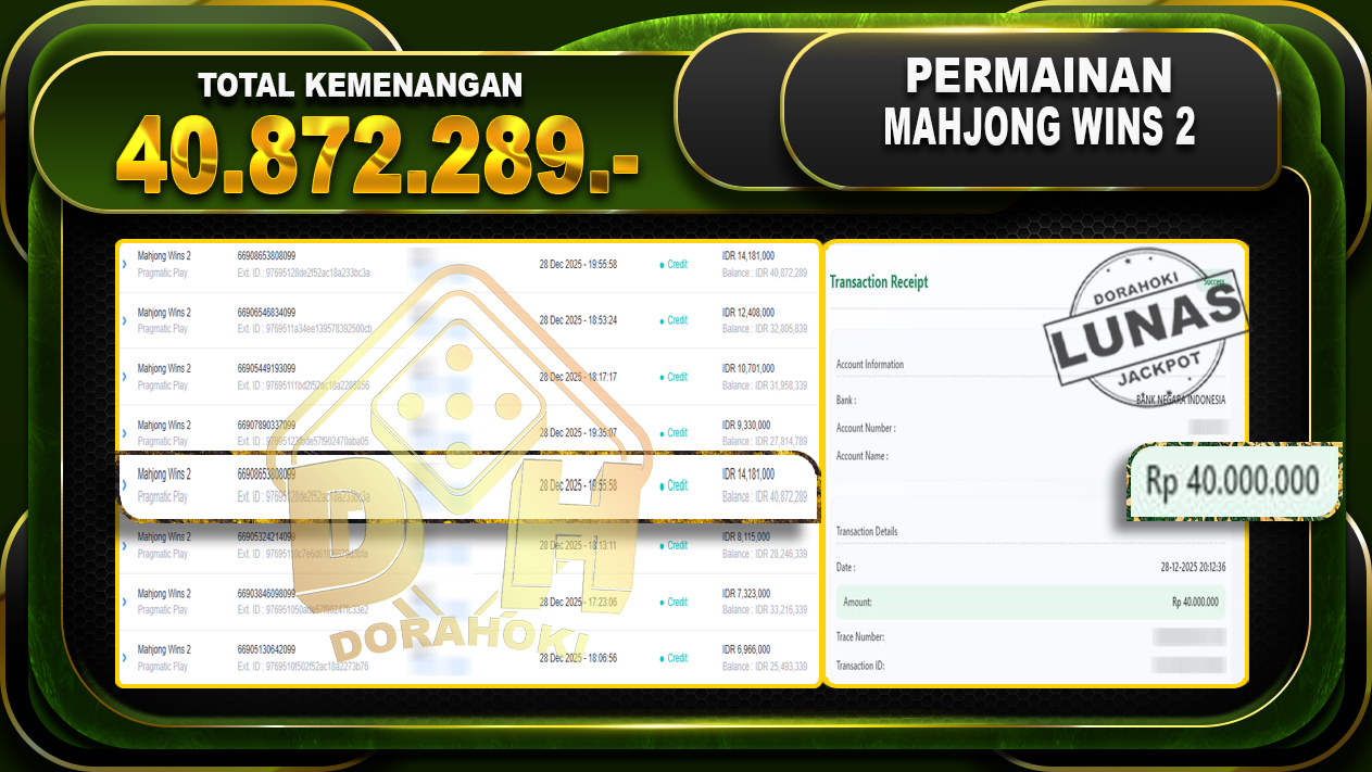 Bukti JP Mahjong Wins 2 – ucapkan selamat kepada user id balxxxx atas kemenangan di Mahjong Wins 2 dengan total kemenangan Rp.40.872.289,- Yang pasti nya langsung LUNAS sesuai bukti ya bosku. Dorahoki nih bosku berapapun akan tetap kami bayar lunas ya bosku.