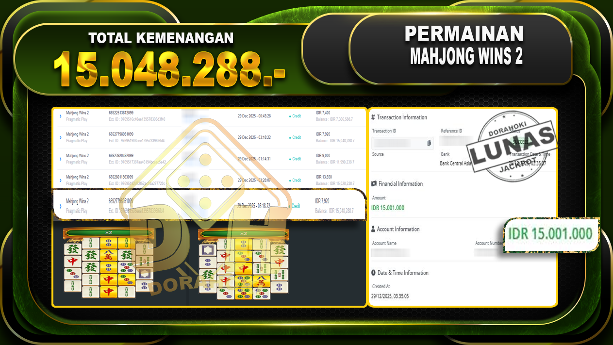 Bukti JP Mahjong Wins 2 – ucapkan selamat kepada user id jayxxxxx atas kemenangan di Mahjong Wins 2 dengan total kemenangan Rp.25.408.288,- Yang pasti nya langsung LUNAS sesuai bukti ya bosku. Dorahoki nih bosku berapapun akan tetap kami bayar lunas ya bosku.