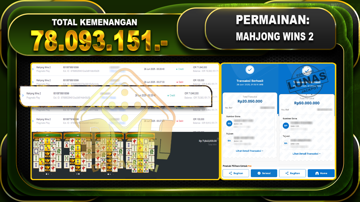 Bukti JP MAHJONG WINS 2 – ucapkan selamat kepada user id BOWxxx atas kemenangan di MAHJONG WINS 2 dengan total kemenangan Rp.78.093.151,- . Yang pasti nya langsung LUNAS sesuai bukti ya bosku. Dorahoki nih bosku berapapun akan tetap kami bayar lunas ya bosku.