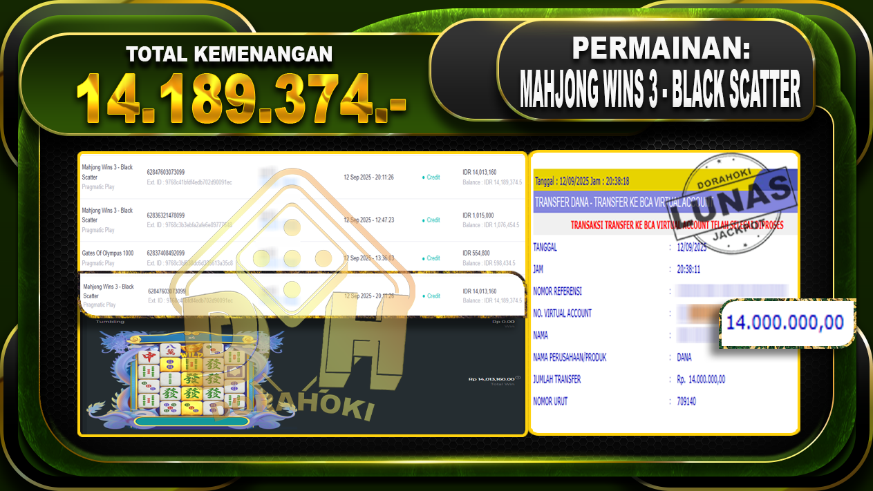 Bukti JP Mahjong Wins 3 – Black Scatter – ucapkan selamat kepada user id Sasxxx atas kemenangan di Mahjong Wins 3 – Black Scatter dengan total kemenangan Rp.14.189.374,- Yang pasti nya langsung LUNAS sesuai bukti ya bosku. Dorahoki nih bosku berapapun akan tetap kami bayar lunas ya bosku