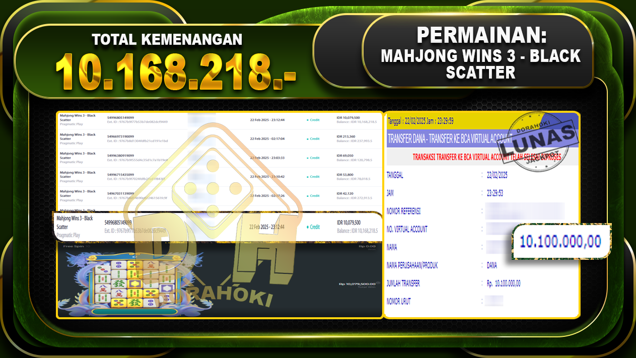 Bukti JP MAHJONG WINS 3 BLACK SCATTER- ucapkan selamat kepada user id rizxxx atas kemenangan di MAHJONG WINS 3 BLACK SCATTER dengan total kemenangan Rp.10.168.218,- . Yang pasti nya langsung LUNAS sesuai bukti ya bosku. Dorahoki nih bosku berapapun akan tetap kami bayar lunas ya bosku.