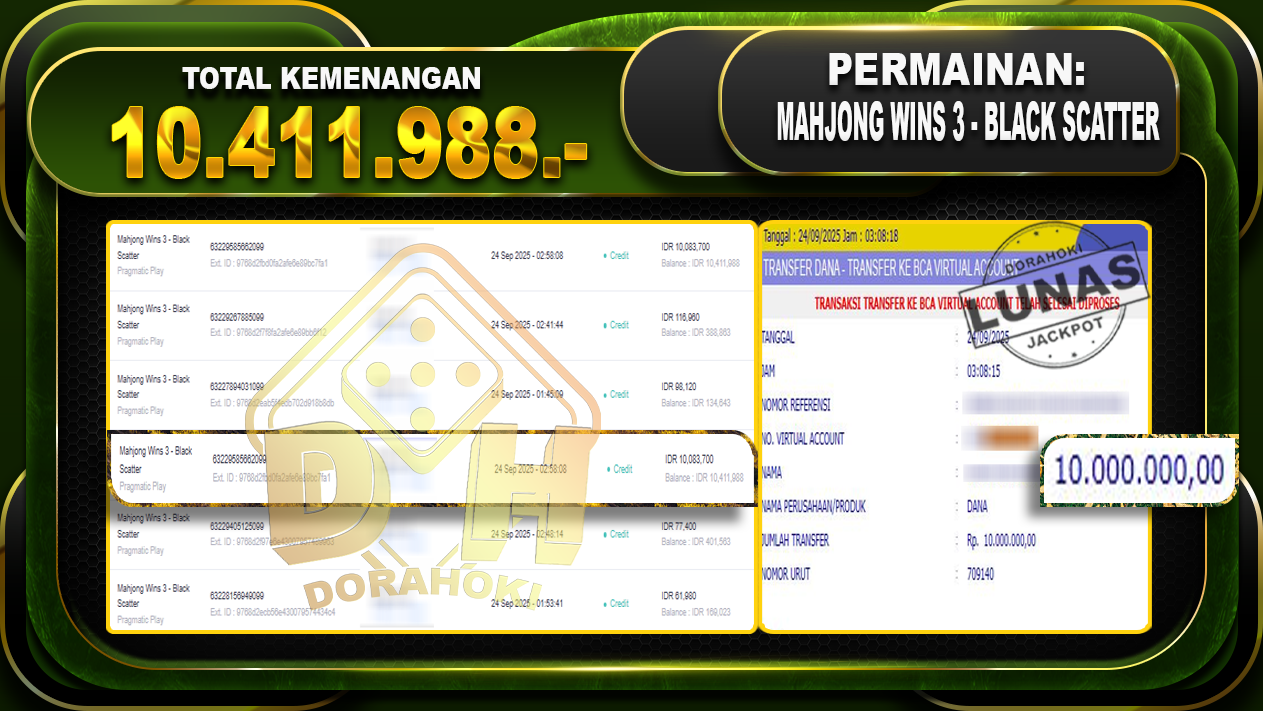 Bukti JP Mahjong Wins 3 – Black Scatter – ucapkan selamat kepada user id Sanxxxxxx atas kemenangan di Mahjong Wins 3 – Black Scatter dengan total kemenangan Rp.10.411.988,- Yang pasti nya langsung LUNAS sesuai bukti ya bosku. Dorahoki nih bosku berapapun akan tetap kami bayar lunas ya bosku