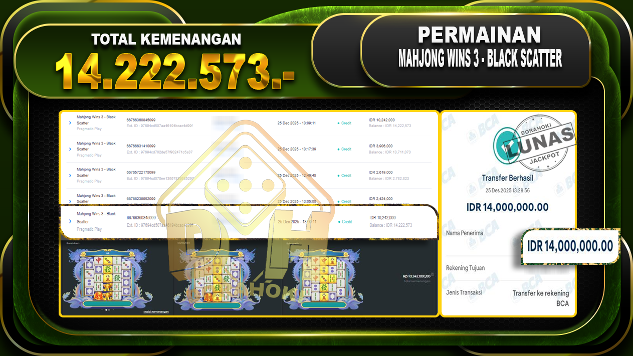 Bukti JP Mahjong Wins 3 – Black Scatter – ucapkan selamat kepada user id slaxxxxx atas kemenangan di Mahjong Wins 3 – Black Scatter dengan total kemenangan Rp.14.222.573,- Yang pasti nya langsung LUNAS sesuai bukti ya bosku. Dorahoki nih bosku berapapun akan tetap kami bayar lunas ya bosku