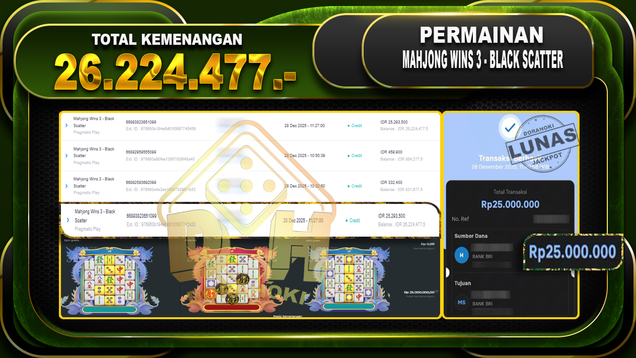 Bukti JP Mahjong Wins 3 – Black Scatter – ucapkan selamat kepada user id manxxxxx atas kemenangan di Mahjong Wins 3 – Black Scatter dengan total kemenangan Rp.26.224.477,- Yang pasti nya langsung LUNAS sesuai bukti ya bosku. Dorahoki nih bosku berapapun akan tetap kami bayar lunas ya bosku
