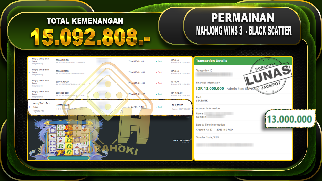 Bukti JP Mahjong Wins 3 – Black Scatter – ucapkan selamat kepada user id slaxxxxx atas kemenangan di Mahjong Wins 3 – Black Scatter dengan total kemenangan Rp.15.092.808,- Yang pasti nya langsung LUNAS sesuai bukti ya bosku. Dorahoki nih bosku berapapun akan tetap kami bayar lunas ya bosku