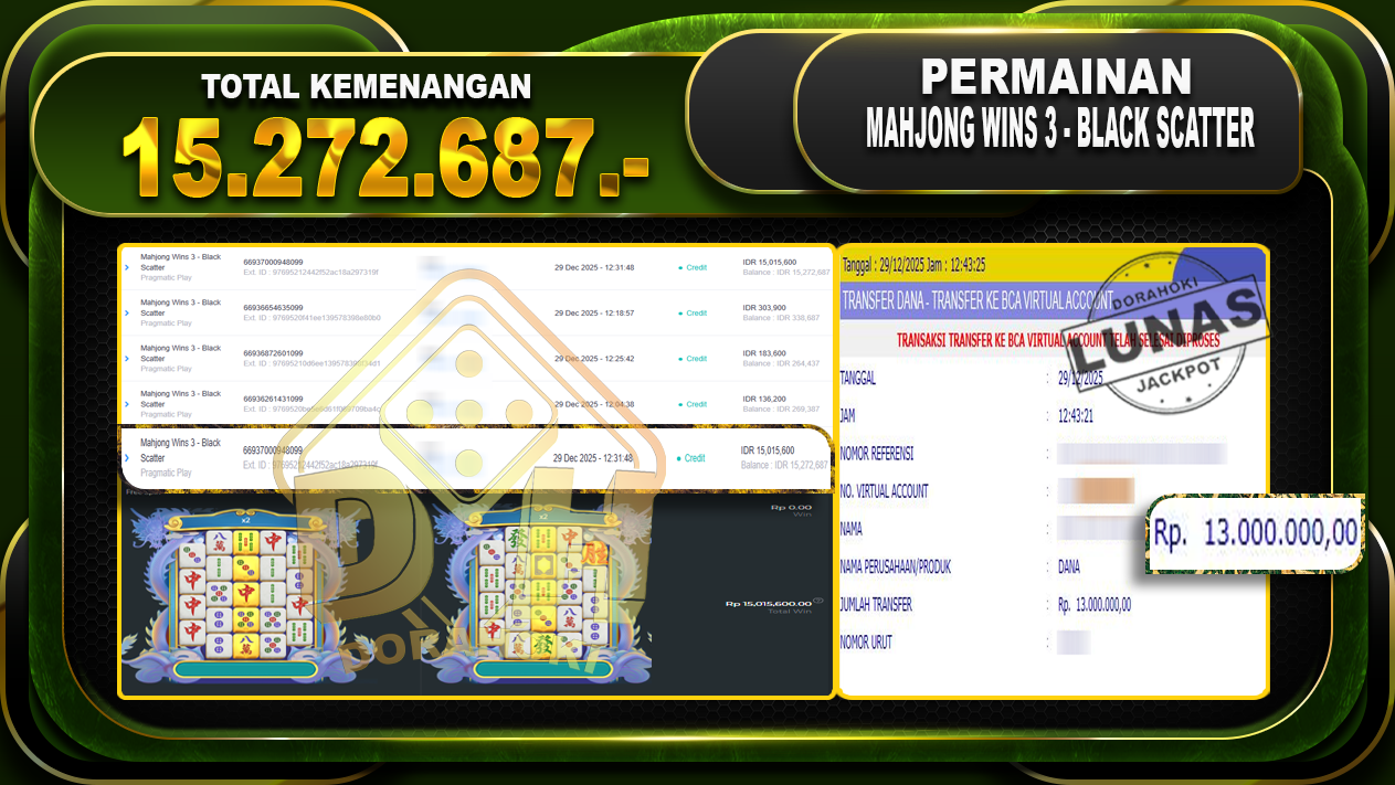Bukti JP Mahjong Wins 3 – Black Scatter – ucapkan selamat kepada user id sibxx atas kemenangan di Mahjong Wins 3 – Black Scatter dengan total kemenangan Rp.15.272.687,- Yang pasti nya langsung LUNAS sesuai bukti ya bosku. Dorahoki nih bosku berapapun akan tetap kami bayar lunas ya bosku
