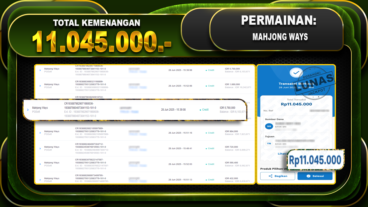 Bukti JP MAHJONG WINS – ucapkan selamat kepada user id GENxxx atas kemenangan di MAHJONG WINS dengan total kemenangan Rp.11.045.000,- . Yang pasti nya langsung LUNAS sesuai bukti ya bosku. Dorahoki nih bosku berapapun akan tetap kami bayar lunas ya bosku.