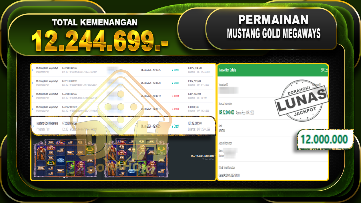 Bukti JP Mustang Gold Megaways – ucapkan selamat kepada user id abaxxxxx atas kemenangan di Mustang Gold Megaways dengan total kemenangan Rp.12.244.699,- Yang pasti nya langsung LUNAS sesuai bukti ya bosku. Dorahoki nih bosku berapapun akan tetap kami bayar lunas ya bosku