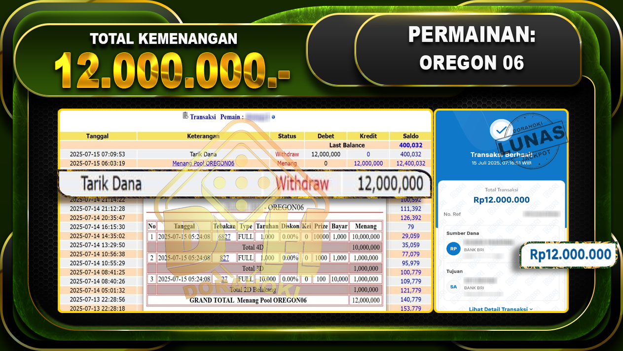 Bukti JP OREGON 06 – ucapkan selamat kepada user id SHExxx atas kemenangan di OREGON 06 dengan total kemenangan Rp.12.000.000- . Yang pasti nya langsung LUNAS sesuai bukti ya bosku. Dorahoki nih bosku berapapun akan tetap kami bayar lunas ya bosku.