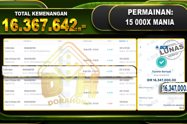 Bukti JP 15.000x Mania – ucapkan selamat kepada user id Sugxxx atas kemenangan di 15.000x Mania dengan total kemenangan Rp.16.367.642,- . Yang pasti nya langsung LUNAS sesuai bukti ya bosku. Dorahoki nih bosku berapapun akan tetap kami bayar lunas ya bosku. Kami mengucapkan Terima Kasih telah mempercayakan DORAHOKI sebagai Bandar Online pilihan dalam bermain judi online….