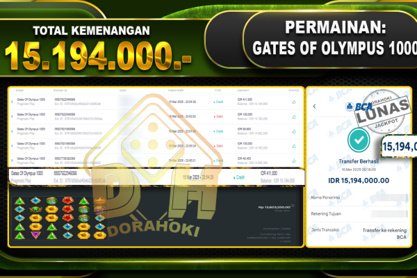 Bukti JP GATES OF OLYMPUS 1000 – ucapkan selamat kepada user id Cawxxx atas kemenangan di GATES OF OLYMPUS 1000 dengan total kemenangan Rp.15.194.000,- . Yang pasti nya langsung LUNAS sesuai bukti ya bosku. Dorahoki nih bosku berapapun akan tetap kami bayar lunas ya bosku. Kami mengucapkan Terima Kasih telah mempercayakan DORAHOKI sebagai Bandar Online pilihan…