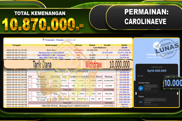 Bukti JP TOGEL Carolinaeve – ucapkan selamat kepada user id Uloxxx atas kemenangan di TOGEL Carolinaeve dengan total kemenangan Rp 10.870.000,- . Yang pasti nya langsung LUNAS sesuai bukti ya bosku. Dorahoki nih bosku berapapun akan tetap kami bayar lunas ya bosku. Kami mengucapkan Terima Kasih telah mempercayakan DORAHOKI sebagai Bandar Online pilihan dalam bermain judi…