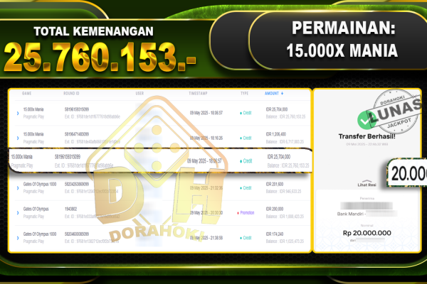 Bukti JP 15.000x Mania – ucapkan selamat kepada user id Chrxx atas kemenangan di 15.000x Mania dengan total kemenangan Rp.25.760.153,- . Yang pasti nya langsung LUNAS sesuai bukti ya bosku. Dorahoki nih bosku berapapun akan tetap kami bayar lunas ya bosku. Kami mengucapkan Terima Kasih telah mempercayakan DORAHOKI sebagai Bandar Online pilihan dalam bermain judi online….