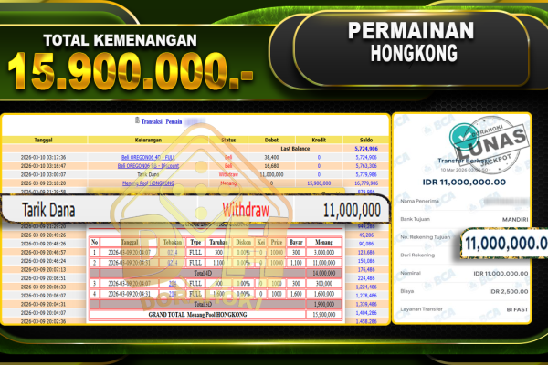 Bukti JP 24Dspin – ucapkan selamat kepada user id rajxxxx atas kemenangan di HONGKONG dengan total kemenangan Rp.11.000.000- . Yang pasti nya langsung LUNAS sesuai bukti ya bosku. Dorahoki nih bosku berapapun akan tetap kami bayar lunas ya bosku.