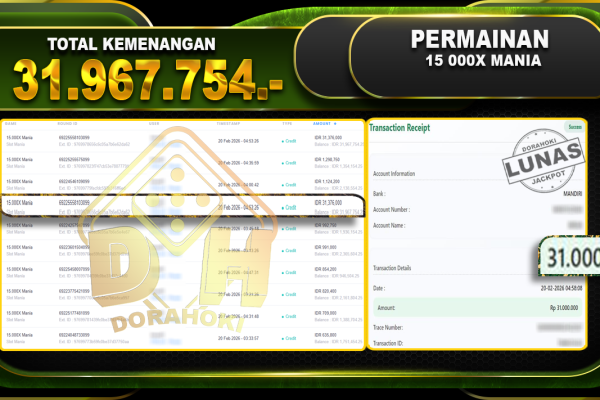 Bukti JP 15.000X Mania – Selamat Kepada User ID : Imrxxxxx atas kemenangan 15.000X Mania Dengan Nominal Sebesar Rp.31.967.754,- Yang pasti nya langsung LUNAS Sesuai Bukti. Kemenangan Berapapun Situs DoraHoki Akan Membayar Lunas yah