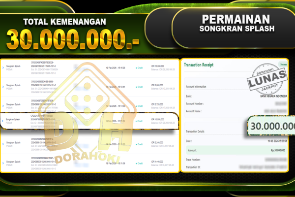 Bukti JP Songkran Splash – Selamat Kepada User ID: Jitxxx atas kemenangan Songkran Splash Dengan Nominal Sebesar Rp.30.000.000,- Yang pasti nya langsung LUNAS Sesuai Bukti. Kemenangan Berapapun Situs DoraHoki Akan Membayar Lunas yah