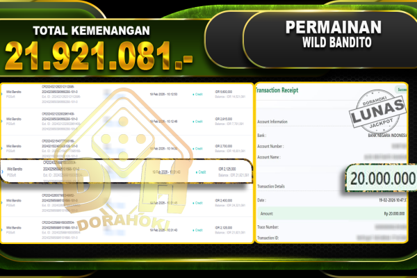 Bukti JP Wild Bandito- ucapkan selamat kepada user id Abixxxx atas kemenangan di Wild Bandito dengan total kemenangan Rp.21.921.081.-. Yang pasti nya langsung LUNAS sesuai bukti ya bosku.Kemenangan Berapapun Situs DoraHoki Akan Membayar Lunas yah