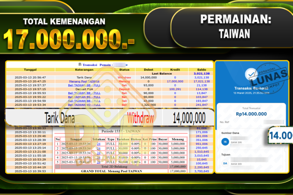 Bukti JP TOGEL TAIWAN- ucapkan selamat kepada user id Wotxxx atas kemenangan di  TOGEL TAIWAN dengan total kemenangan Rp.17.000.000,- . Yang pasti nya langsung LUNAS sesuai bukti ya bosku. Dorahoki nih bosku berapapun akan tetap kami bayar lunas ya bosku. Kami mengucapkan Terima Kasih telah mempercayakan DORAHOKI sebagai Bandar Online pilihan dalam bermain judi online. Semoga…