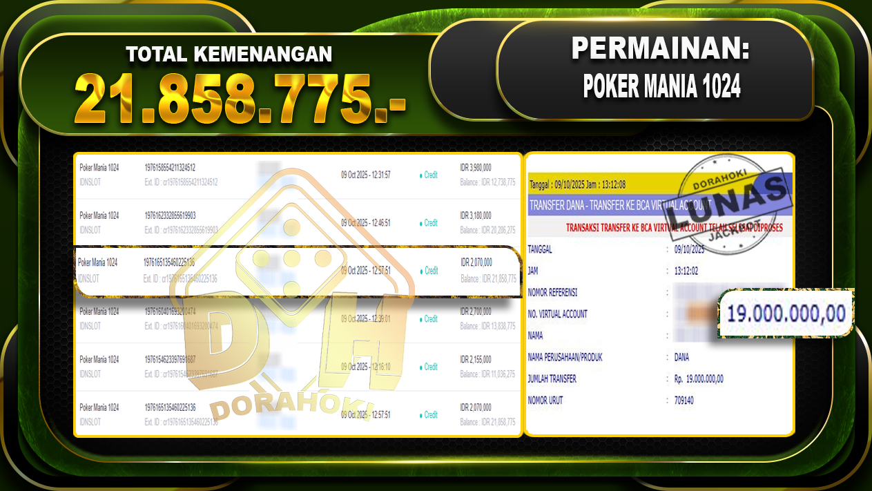 Bukti JP Poker Mania 1024 – ucapkan selamat kepada user id rahxxxxxx atas kemenangan di Poker Mania 1024 dengan total kemenangan Rp.21,858,775,- Yang pasti nya langsung LUNAS sesuai bukti ya bosku. Dorahoki nih bosku berapapun akan tetap kami bayar lunas ya bosku