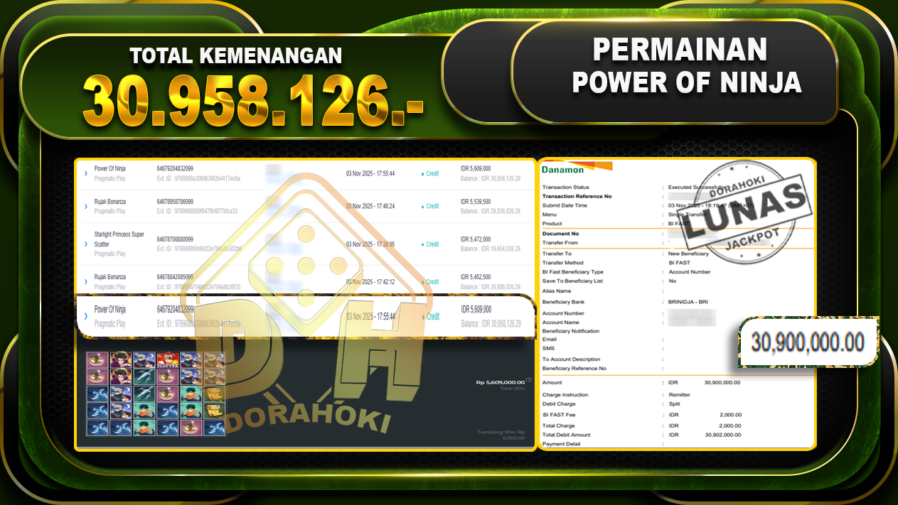Bukti JP Power Of Ninja – ucapkan selamat kepada user id sinxxx atas kemenangan di Power Of Ninja  dengan total kemenangan Rp.30.958.126,- . Yang pasti nya langsung LUNAS sesuai bukti ya bosku. Dorahoki nih bosku berapapun akan tetap kami bayar lunas ya bosku.