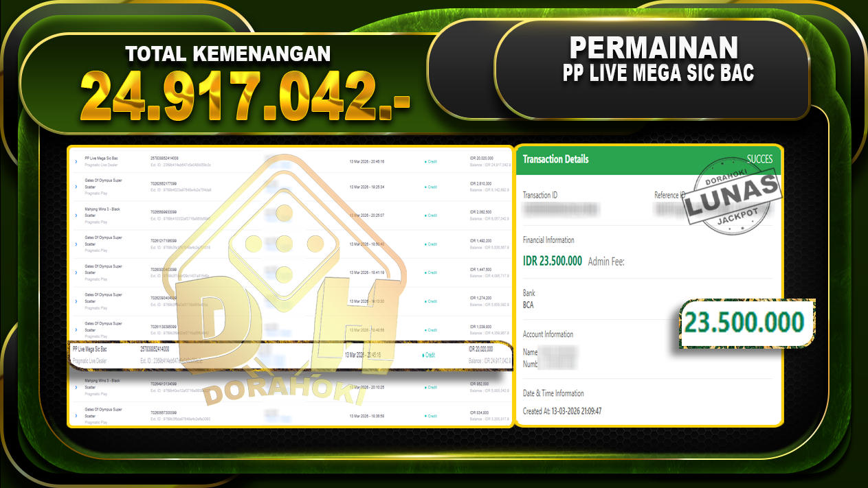 Bukti JP PP Live Mega Sic Bac – ucapkan selamat kepada user id Doixxx atas kemenangan di PP Live Mega Sic Bac dengan total kemenangan Rp.24.917.042,- Yang pasti nya langsung LUNAS Sesuai Bukti.