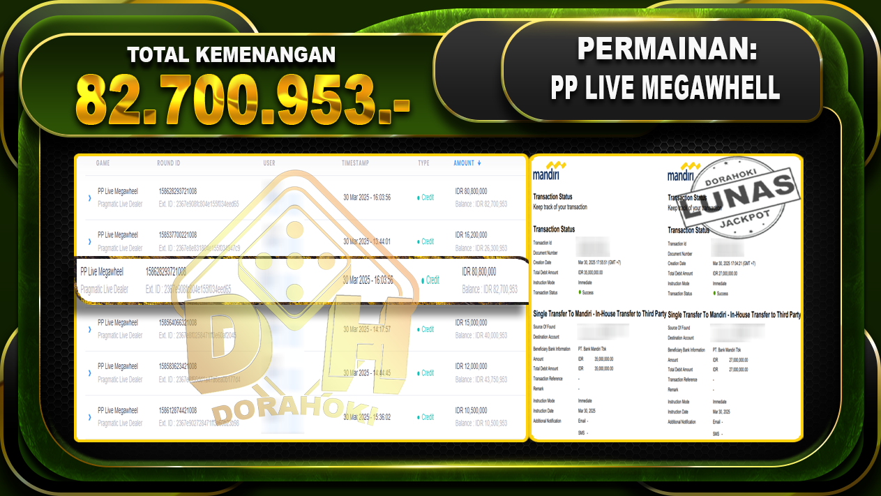Bukti JP PP LIVE MEGAWHEEL – ucapkan selamat kepada user id Jojxxx atas kemenangan di PP LIVE MEGAWHEEL dengan total kemenangan Rp.82.700.953,- . Yang pasti nya langsung LUNAS sesuai bukti ya bosku. Dorahoki nih bosku berapapun akan tetap kami bayar lunas ya bosku.