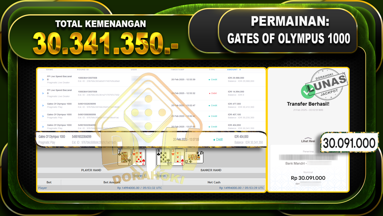 Bukti JP PP LIVE SPEED BACCARAT B – ucapkan selamat kepada user id SEPTA5xxx atas kemenangan di LIVE SPEED BACCARAT B dengan total kemenangan Rp.30.341.350,- . Yang pasti nya langsung LUNAS sesuai bukti ya bosku. Dorahoki nih bosku berapapun akan tetap kami bayar lunas ya bosku.