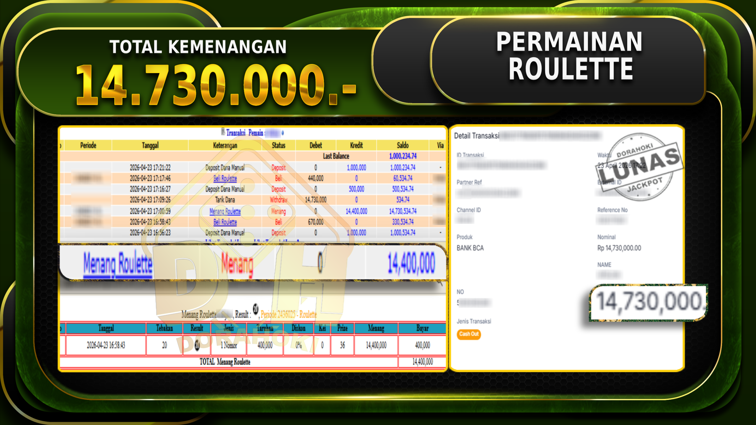Bukti JP ROULETTE – ucapkan selamat kepada user id  Afrxxx atas kemenangan di  ROULETTE  dengan total kemenangan Rp.14.730.000,- . Yang pasti nya langsung LUNAS sesuai bukti ya bosku. Kemenangan Berapapun Situs DoraHoki Akan Membayar Lunas yah