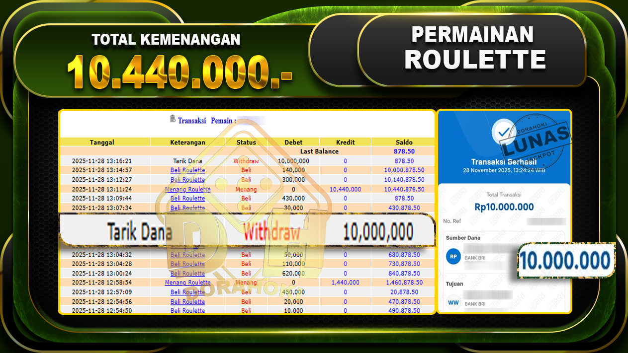Bukti JP Roulette – ucapkan selamat kepada user id sakxxxx atas kemenangan di Roulette dengan total kemenangan Rp.10.440.000,- Yang pasti nya langsung LUNAS sesuai bukti ya bosku. Dorahoki nih bosku berapapun akan tetap kami bayar lunas ya bosku.