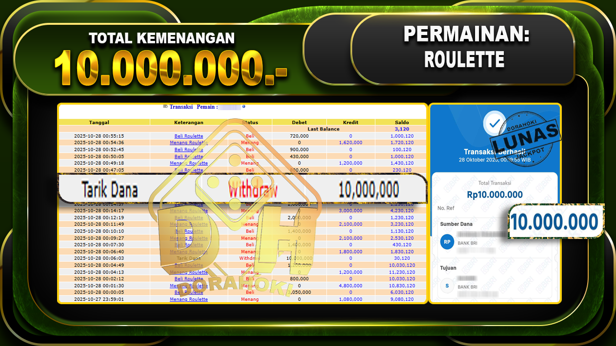 Bukti JP Roulette – ucapkan selamat kepada user id tamxxxxx atas kemenangan di Roulette dengan total kemenangan Rp.10.000.000,- Yang pasti nya langsung LUNAS sesuai bukti ya bosku. Dorahoki nih bosku berapapun akan tetap kami bayar lunas ya bosku.