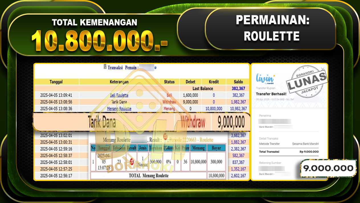Bukti JP ROULETTE GAMES – ucapkan selamat kepada user id Omaxxx atas kemenangan di ROULETTE GAMES dengan total kemenangan Rp.10.800.000,- . Yang pasti nya langsung LUNAS sesuai bukti ya bosku. Dorahoki nih bosku berapapun akan tetap kami bayar lunas ya bosku.
